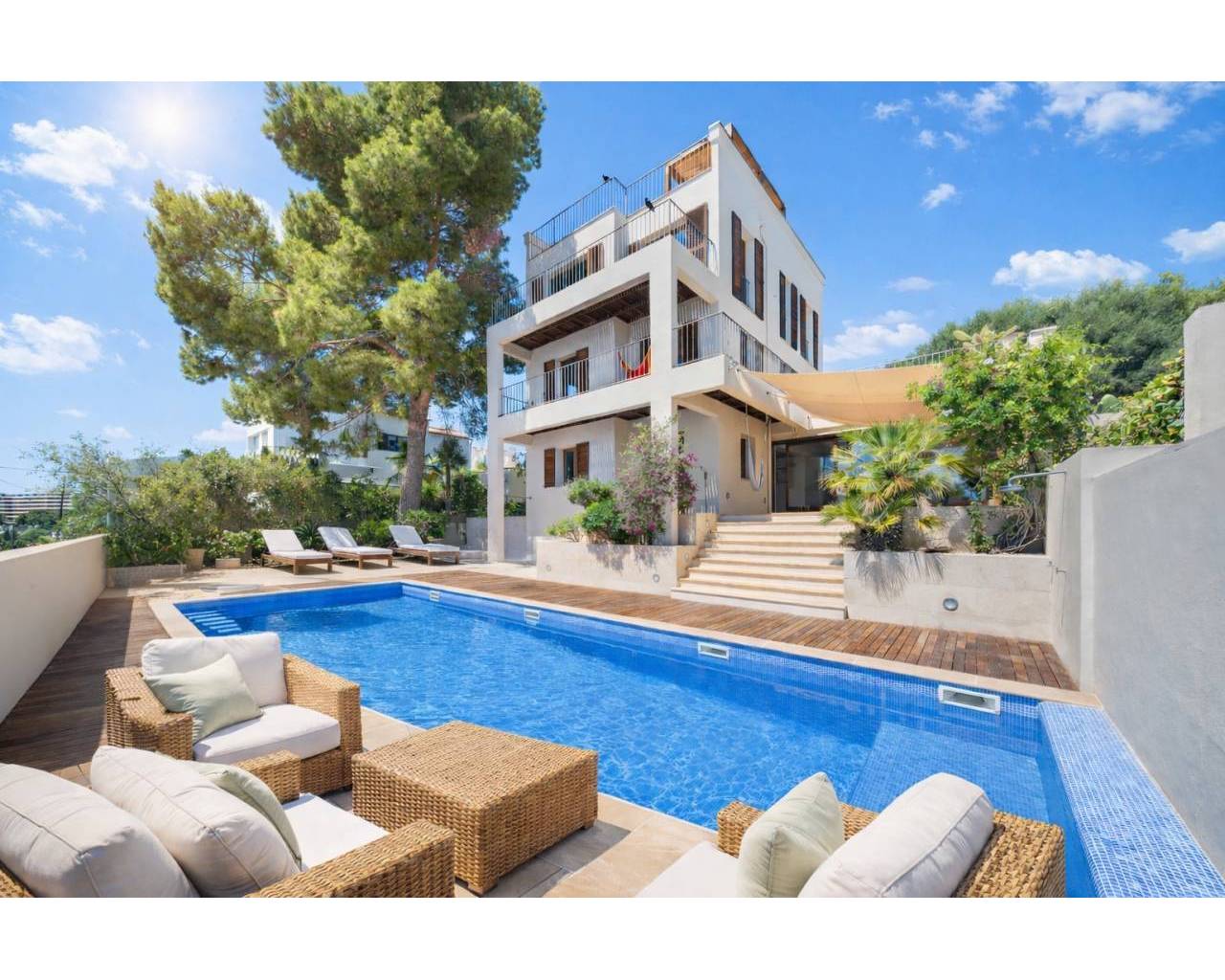 Auf dem ca. 542 m² großen Grundstück befinden sich ein sonniger Außenbereich mit Salzwasserpool, tropisch angelegtem Garten, einem Poolhaus sowie einer Doppelgarage – ideal für luxuriöses Wohnen auf höchstem Niveau.