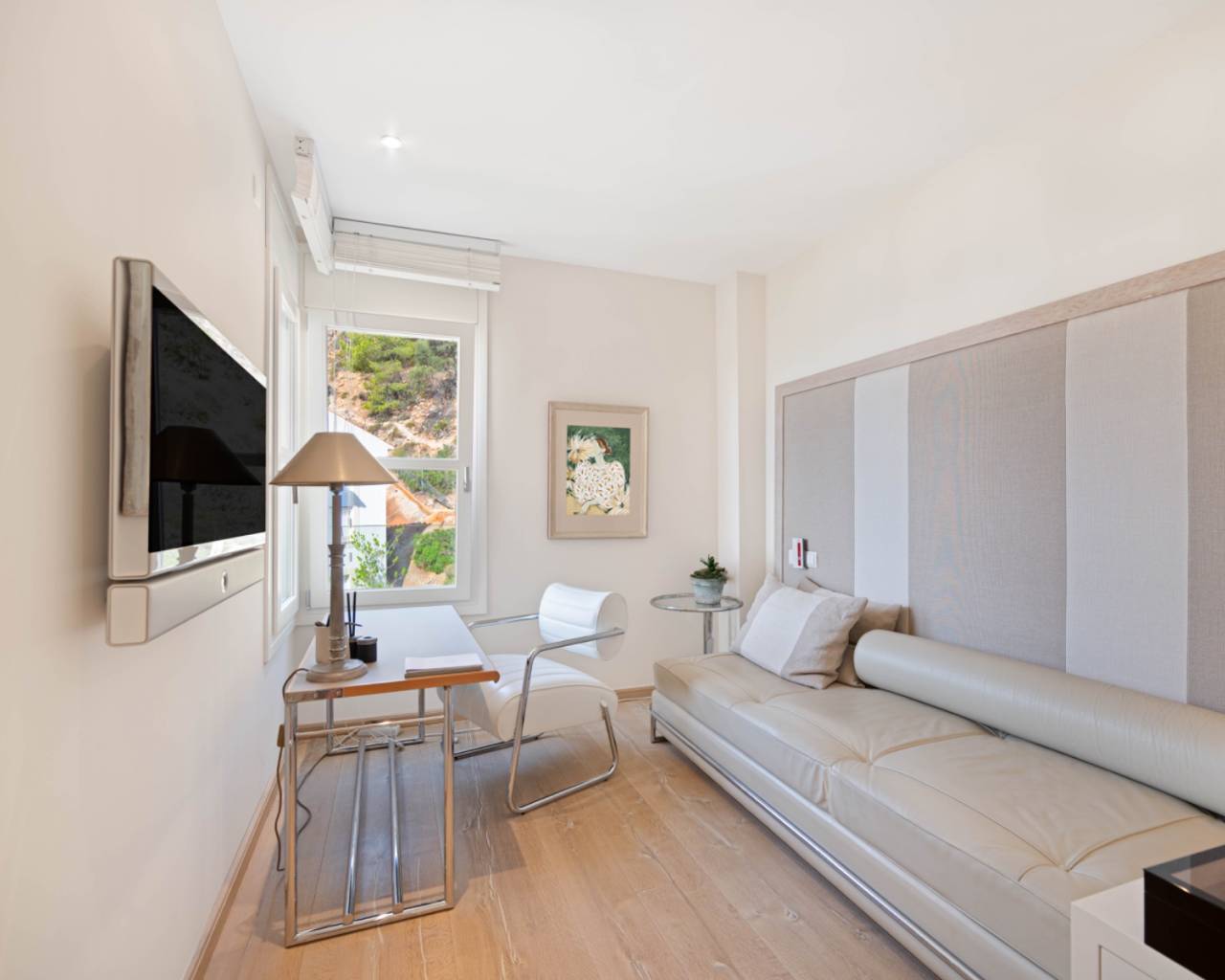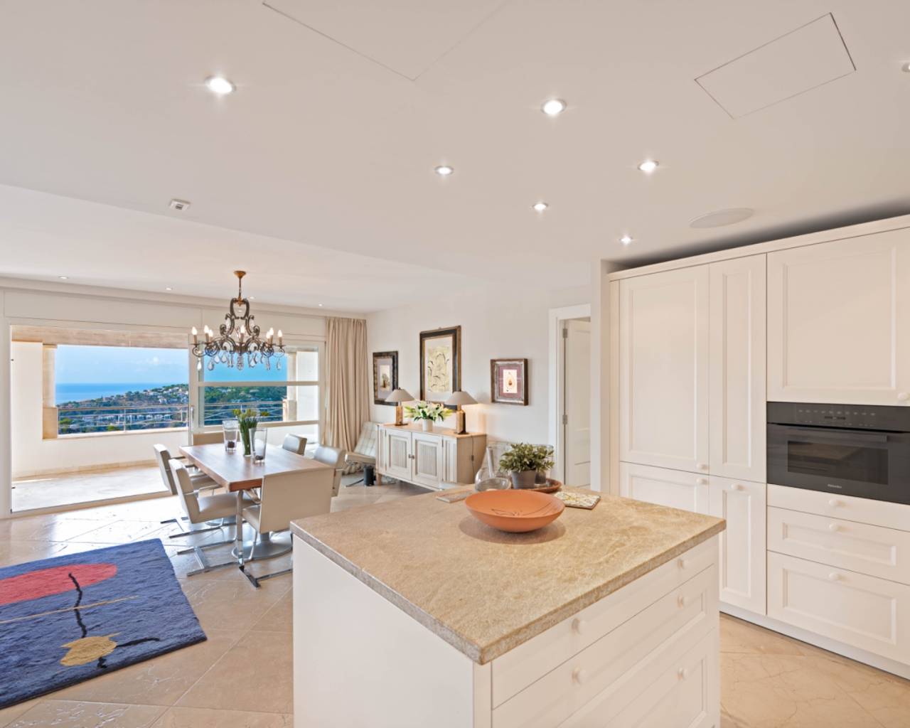 Der großzügige Wohn- und Essbereich mit offener Küche führt zu einer weitläufigen Terrasse, die das Meer nahezu in den Wohnraum holt. Das Penthouse verfügt über drei elegante Schlafzimmer, jeweils mit luxuriösen Badezimmern en suite, sowie ein zusätzliches Gästebad. Aus jedem Raum eröffnet sich ein atemberaubender Blick auf den Naturhafen und die majestätische Tramuntana-Gebirgskette.