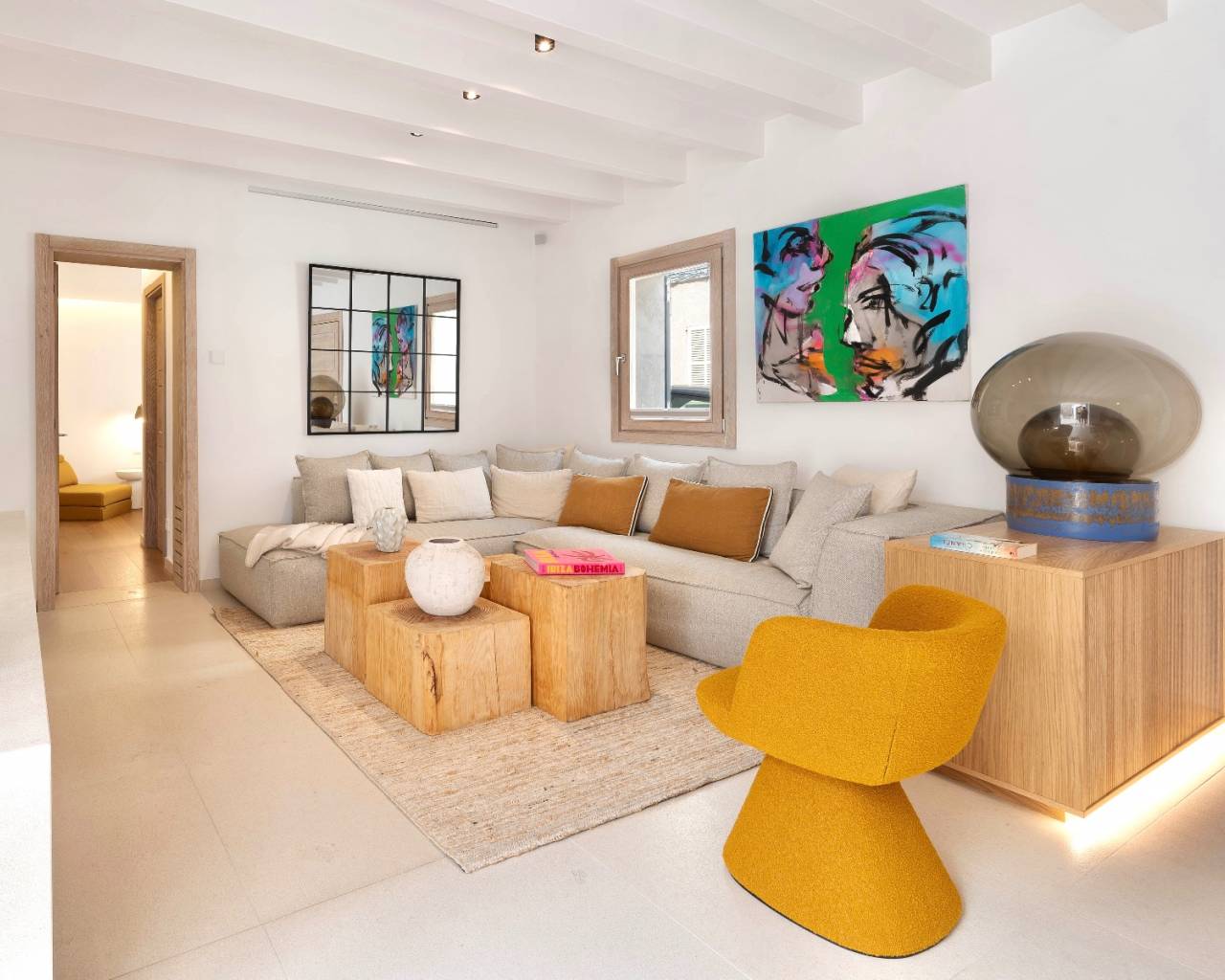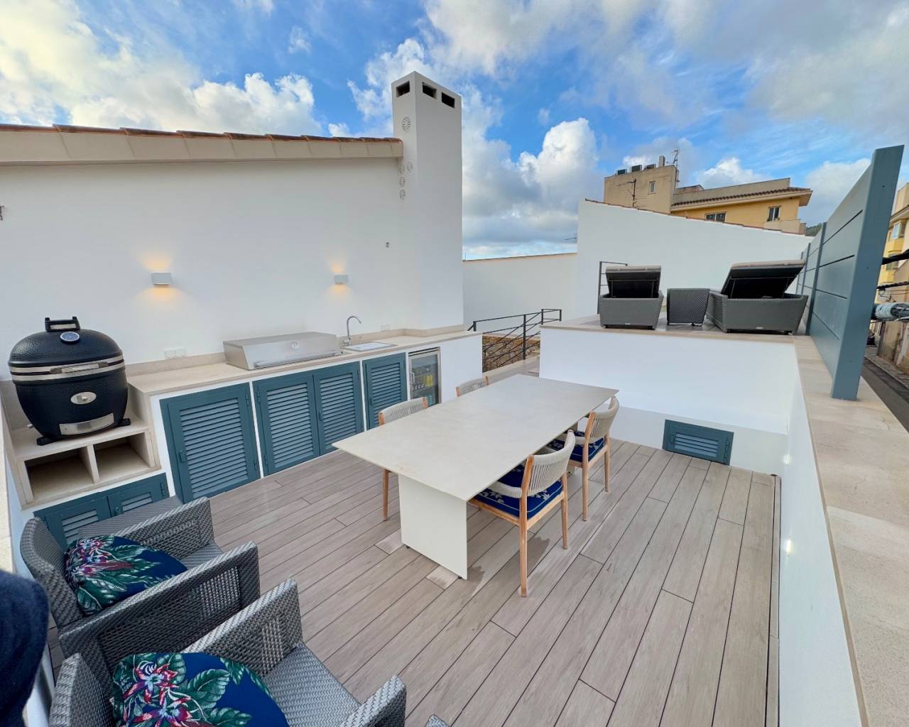Stadthaus im Herzen von Andratx. Die Innenräume strahlen mit natürlichem Tageslicht und sind nahtlos mit zeitgenössischer Ästhetik und traditionellen mallorquinischen Elementen kombiniert. Der geräumige Wohnbereich ist Ausdruck dieser gelungenen Symbiose aus sorgfältig gearbeiteten Holzdetails und Holzbalkendecken, die ein Gefühl von Wärme und Charakter ausstrahlen. Der Essbereich bietet einen einladenden Platz für Familie und Freunde und wird durch eine angrenzende Designerküche mit Spitzengeräten ergänzt. Mit Blick auf einen privaten Außenhof ist die vollausgestattete Einbauküche eine kulinarische Oase, die zu Kreativität und Genuss einlädt. Eine diskret versteckte Waschküche bietet Funktionalität und Komfort, ohne die Ästhetik der Immobilie zu beeinträchtigen.